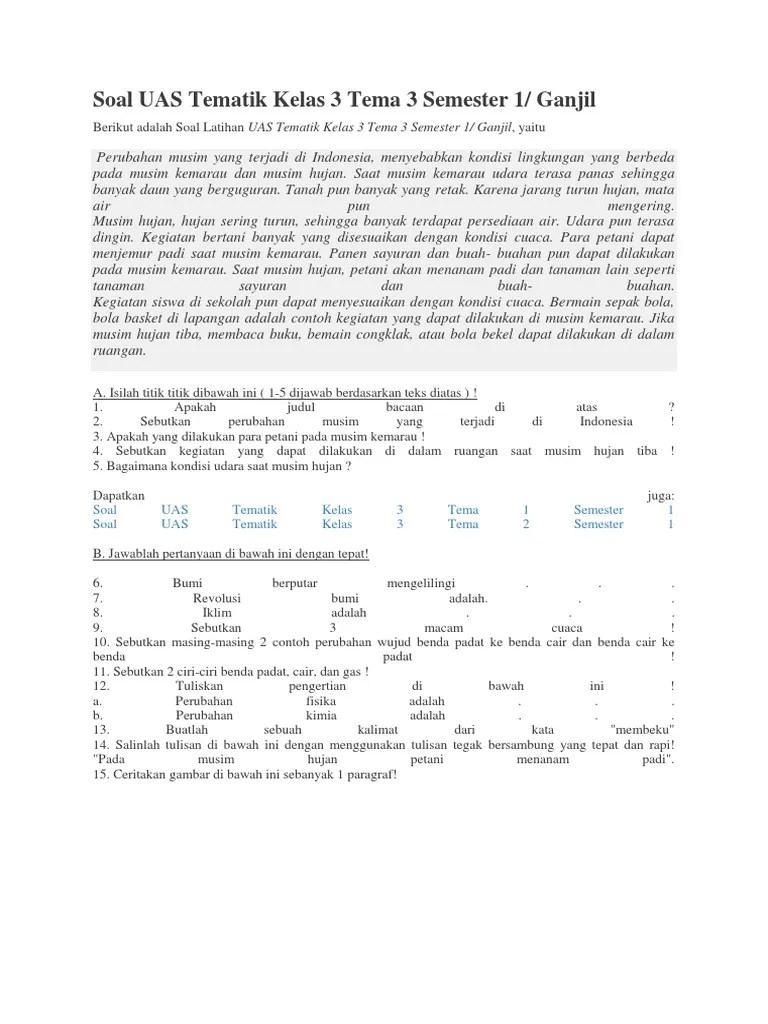 Laporan ujian pas / uas . Penilaian (akhir semester) dimasukkan ke dalam kategori penilaian sumatif, karena diselenggarakan dalam suatu periode waktu tertentu. Muatan pelajaran yang diujikan ini adalah materi untuk kelas 3 sd tema 1 subtema 3 dan sub tema 4. Download/ unduh soal latihan ulangan harian/ penilaian harian ( ph ) tematik kelas iii sd/ mi tema iii semester ganjil/ gasal dengan sumber buku bse terbitan . Berikut ini adalah kumpulan contoh soal pas uas untuk tema 3 kelas 3 sd mi semester 1 yang disertai dengan kunci jawaban tahun 2021. Karena ini adalah contoh latihan soal tema 3 kelas 3 sd/mi di tahap akhir semester 1, maka soal . Berikut ini adalah kumpulan soal uas kelas 3 sd semester 1 dan file download soal uas pkn, bahasa indonesia, ips, ipa, matematika, dan bahasa inggris. Soal yang kami sajikan ini sejumlah 20 soal . Soal kelas 3 sd yang akan kita bahas adalah soal pilihan ganda yang berjumlah . Website berisi latihan soal tematik kurikulum 2013, soal tema, soal subtema, soal ktsp, soal uas dan uts, soal pas dan pts, download latihan .